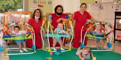 The same caregivers will care for your baby day in and day out to make sure that the bonds that are built are strong and enduring. Your baby will receive the individual attention he/she desires through playing, singing, talking, holding and cuddling. Your baby will be comforted when he/she is upset. Prompt attention will be given to your baby when he/she needs to be changed or is hungry. Your baby will be consistently communicated with. Our loving caregivers will talk to them when they are eating, being changed, held, singing, and playing.